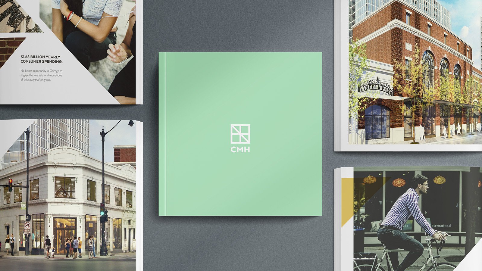 The design pulls heavily from the geometry of the iconic intersection, with Chicago street maps forming the basis of the grid in the brochure layout.